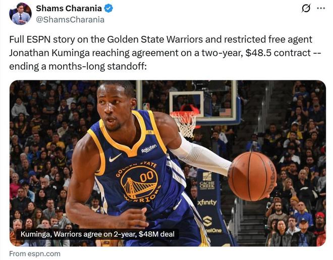 根據(jù)ESPN名記Shams報(bào)道,經(jīng)過整個(gè)休賽期的拉扯,勇士隊(duì)終于與庫明加完成續(xù)約。